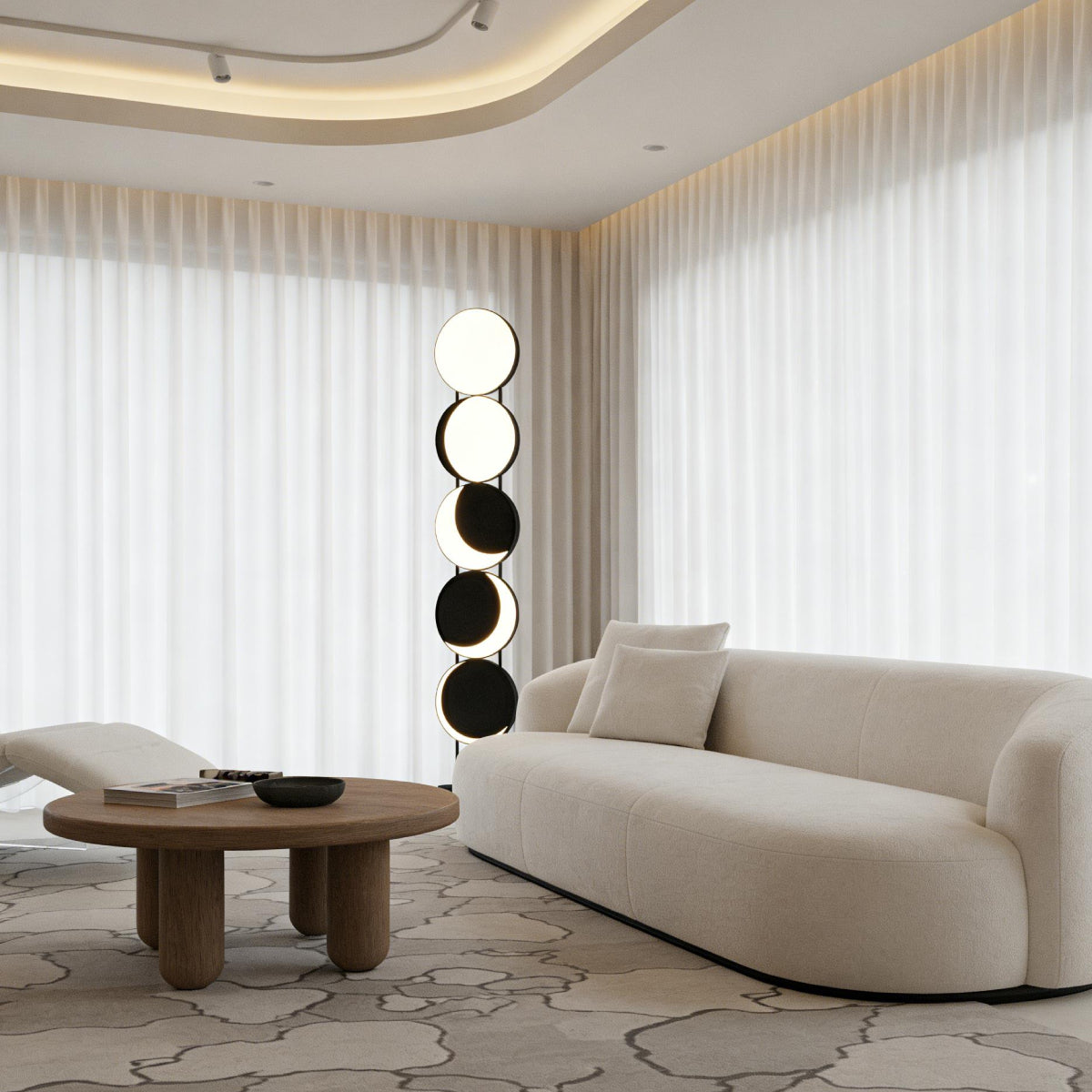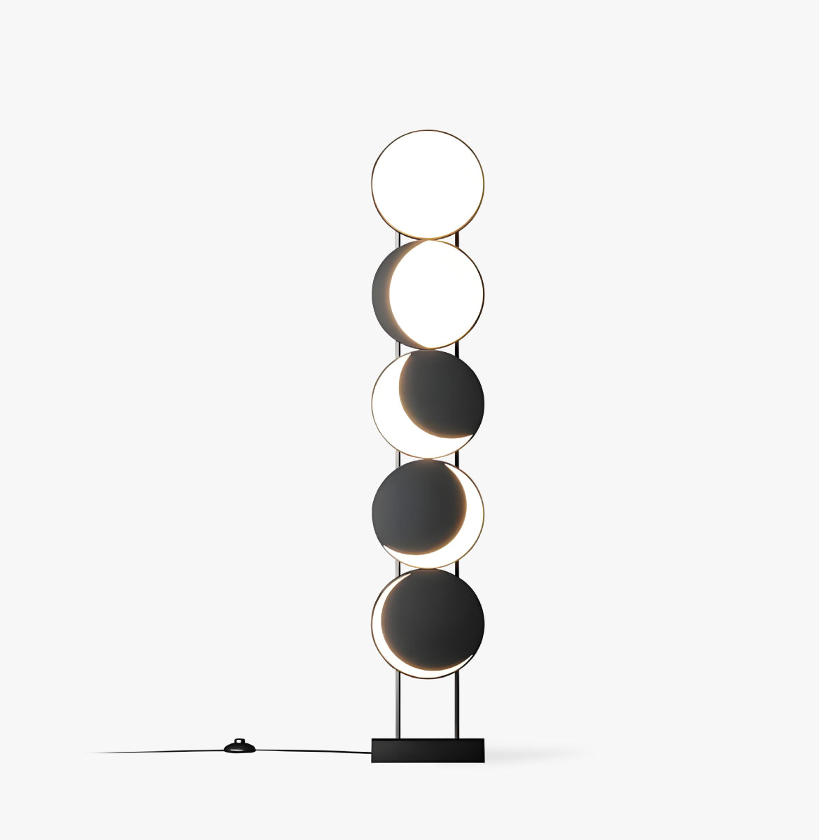 The Lunar Motion Floor Lamp features a high-color-rendering baked finish and transparent acrylic shade. The sturdy, thickened metal base includes an ultra-thick alloy chassis with an internal counterweight, ensuring stability. The foot-operated switch adds convenience, making it an ideal lighting solution for modern spaces.