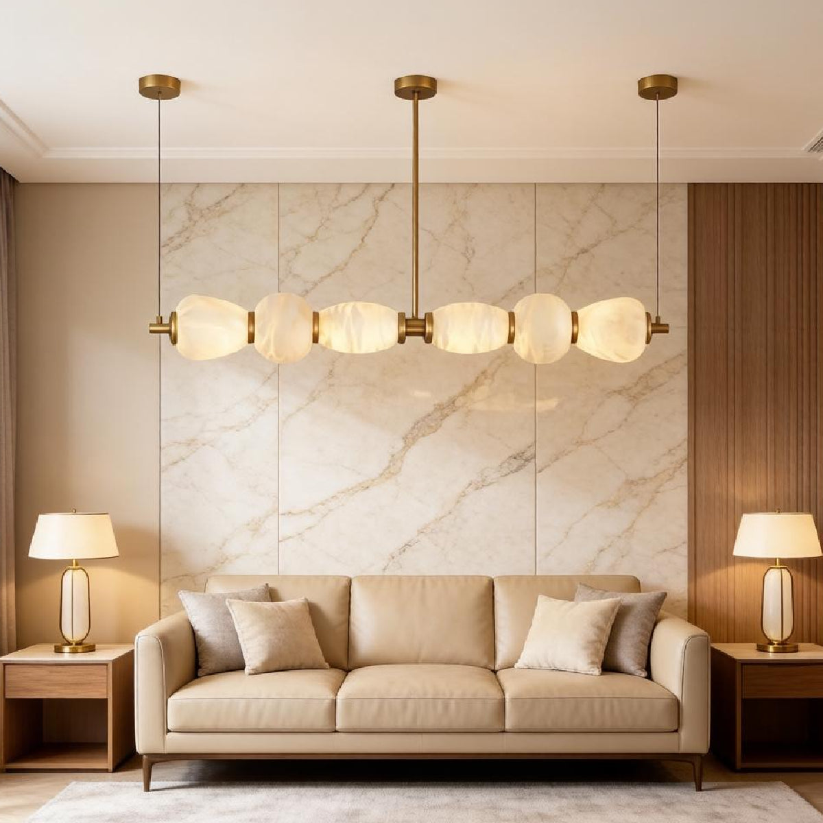 The Alabaster Linear Island Chandelier blends organic beauty with modern design. Its gourd-shaped alabaster elements are linked in a cascading, biomorphic design, suspended by a three-point steel wire system, creating a floating effect. Designed specifically for dining areas, island counters, or long tables, this piece offers soft, even lighting that enhances your space with understated elegance.