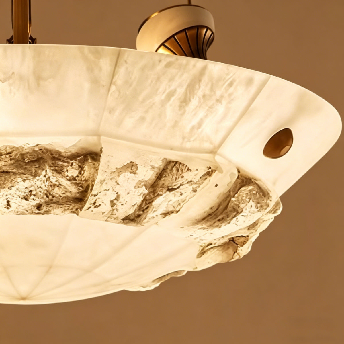 The Elio Alabaster Ceiling Light combines a striking flying saucer design with natural stone textures and vintage-inspired detailing. Its sculpted, embossed canopy and chain suspension create a floating effect, blending retro and modern styles. With a semi-flush mount and chain design, this fixture adds a unique touch of elegance to contemporary interiors.