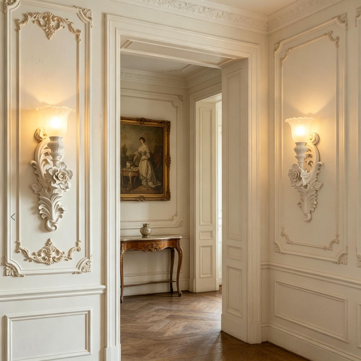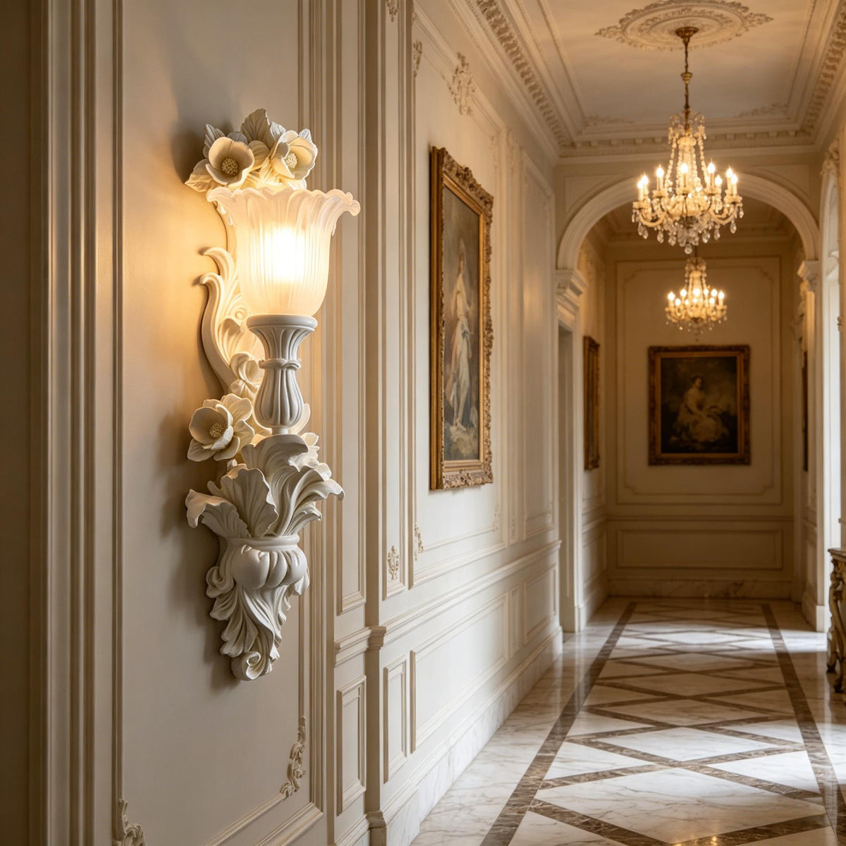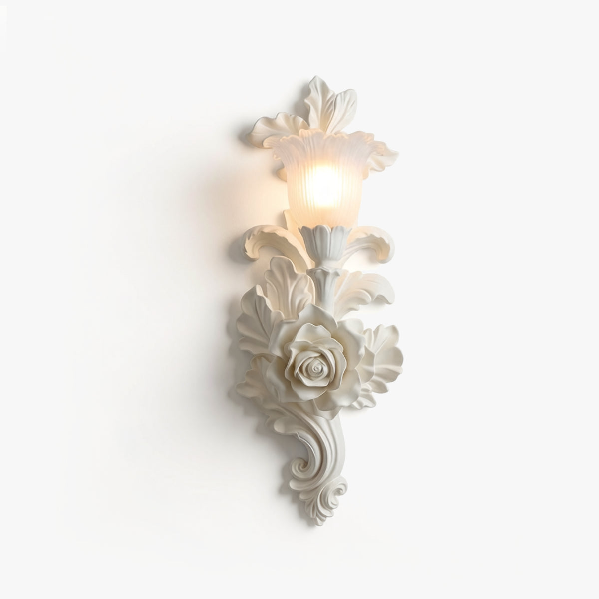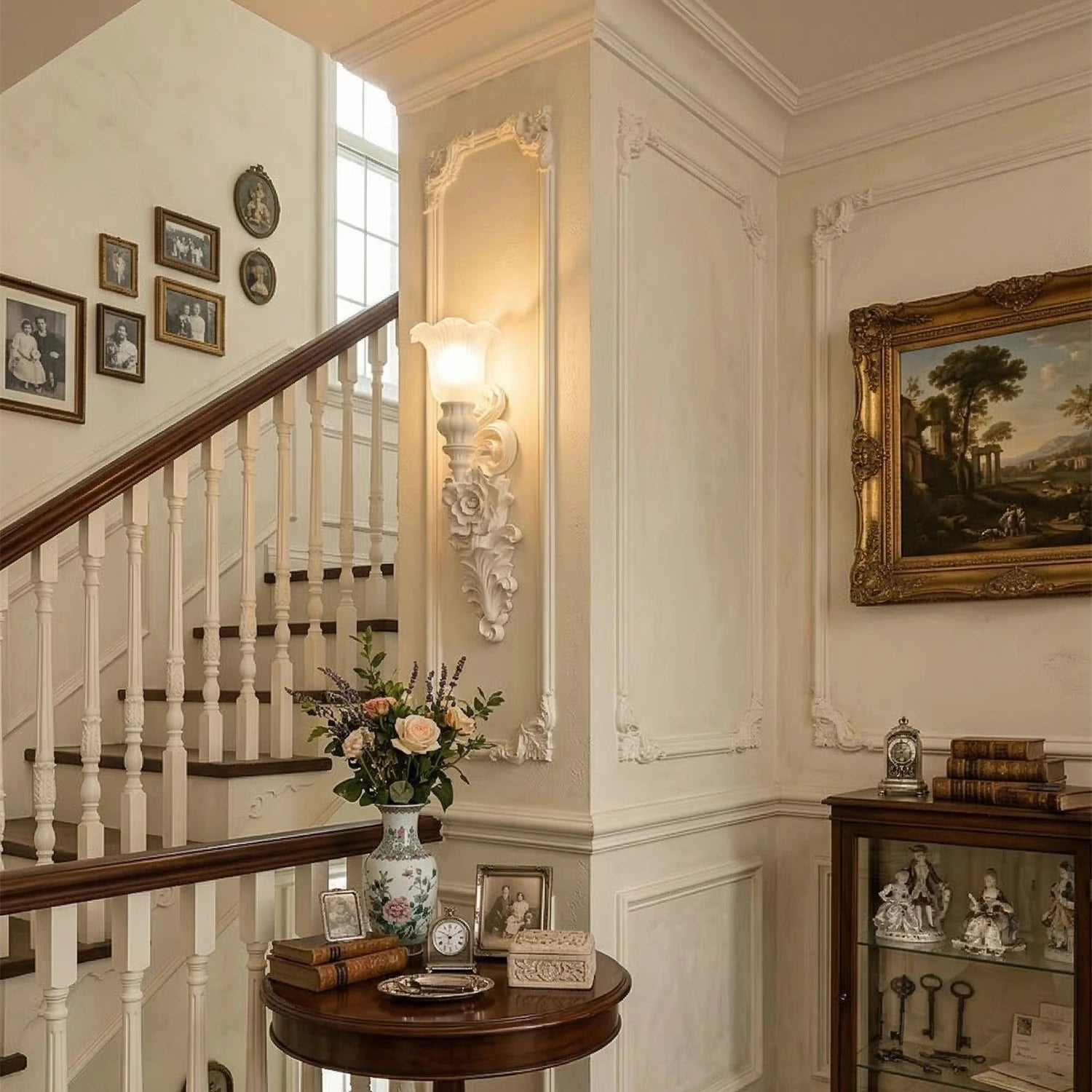 The Carved Flowers Plaster Wall Lamp features intricate three-dimensional rose, camellia, and cattail leaf patterns, all sculpted from high-quality gypsum. The layered petals are beautifully detailed, and the frosted glass lampshade adds elegance. The lamp is designed with a solid, crack-resistant structure, treated with a protective coating to prevent moisture and dust, ensuring long-lasting, vibrant white finishes.