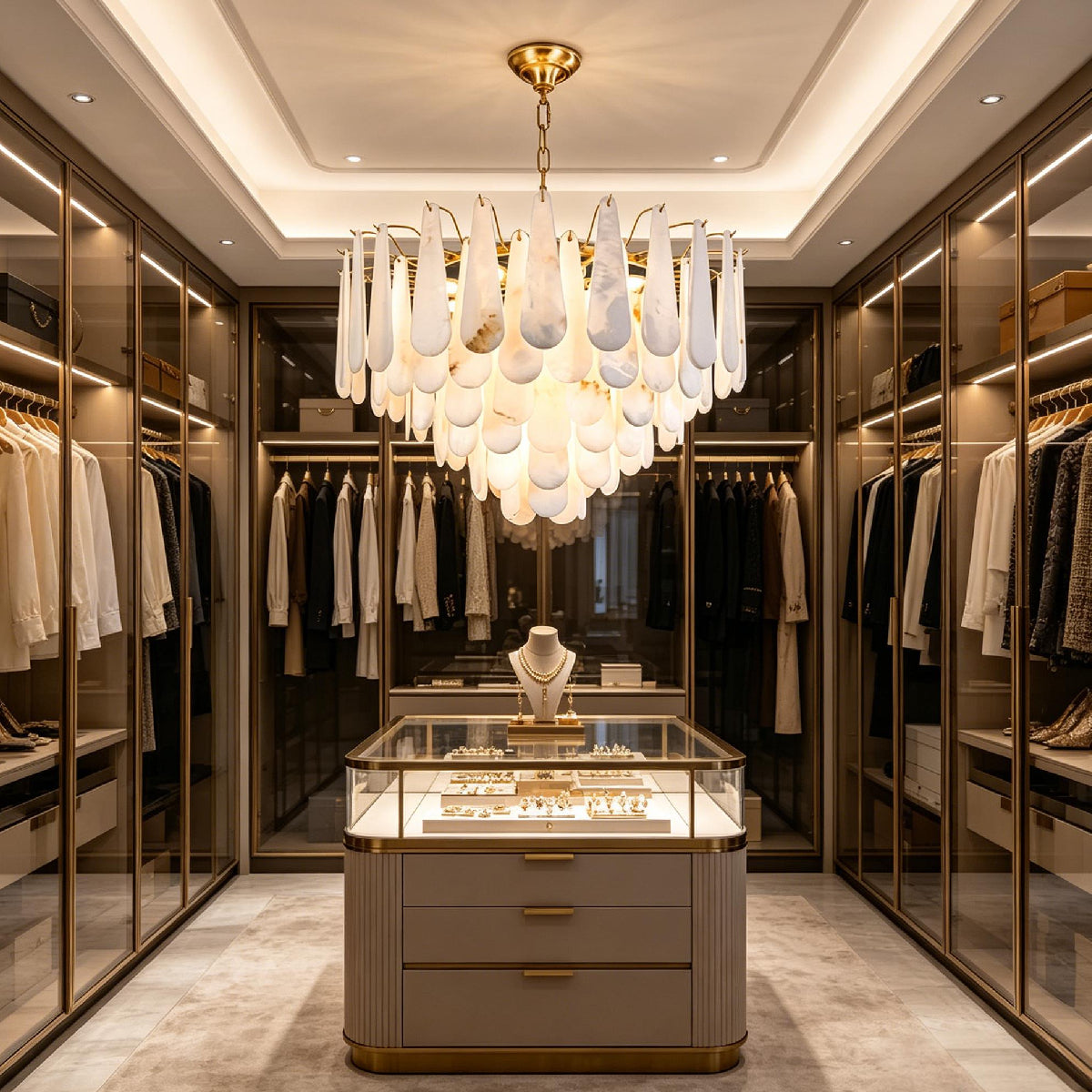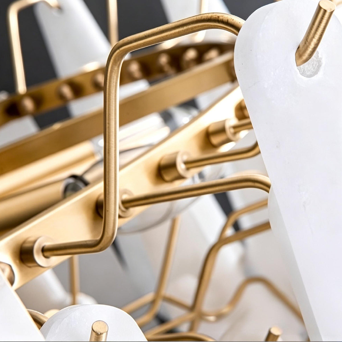 Inspired by the shape of water droplets, the Leon Alabaster Chandelier features a cascading design that mimics a natural stone waterfall with ink-like veining. The open brass frame and multiple hanging drops create an elegant, luxurious feel, while the antique-finished brass adds a vintage touch. This chandelier perfectly complements modern, luxury interiors.