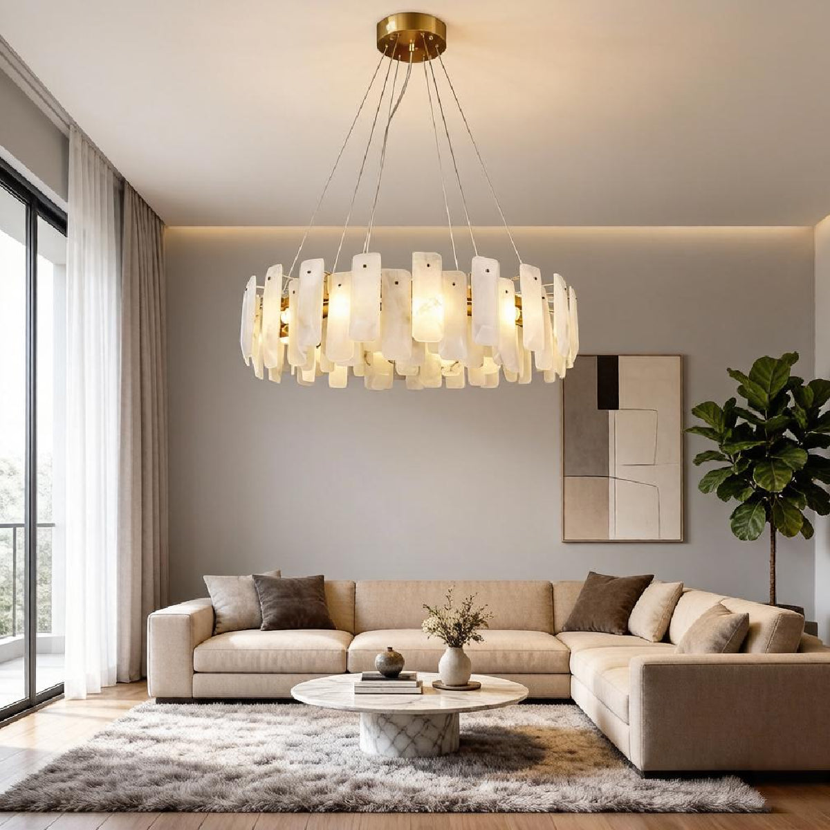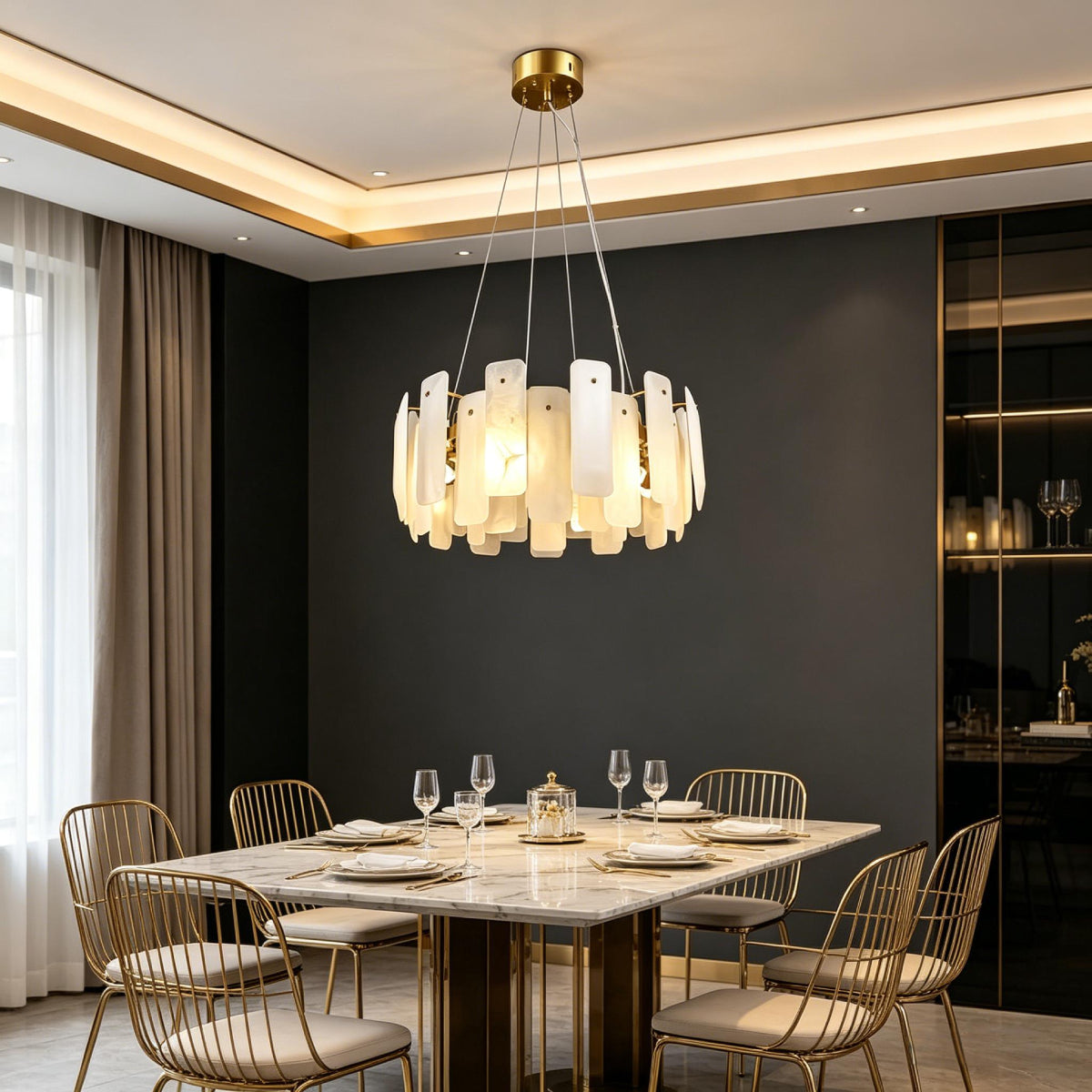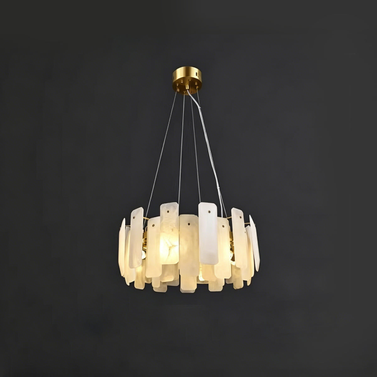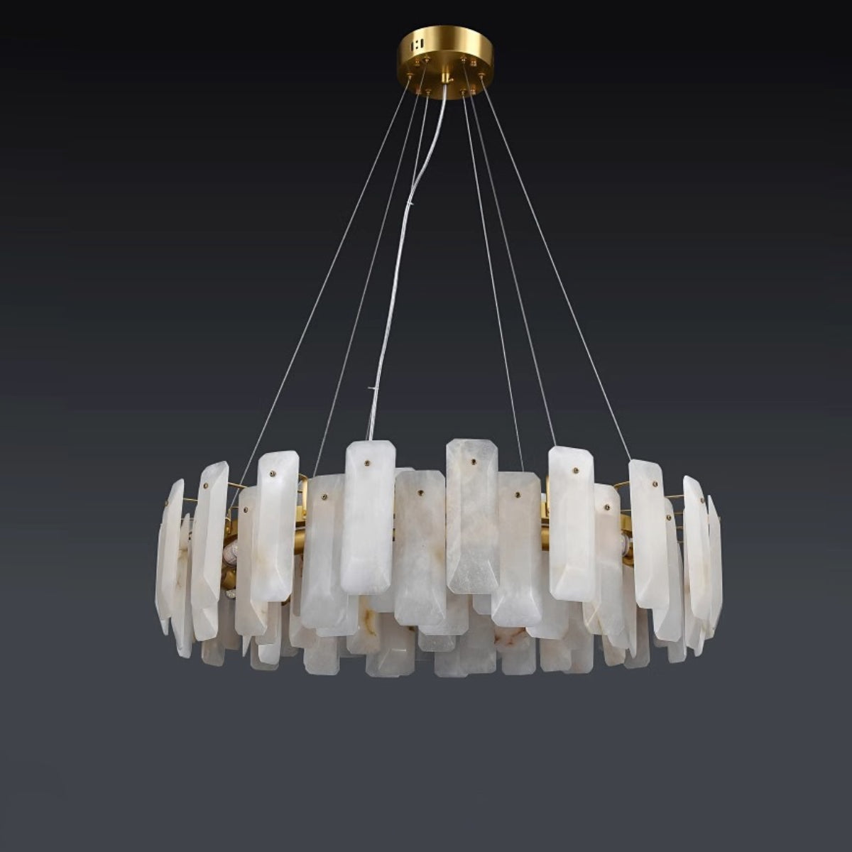 Inspired by accordion pleats, the Vakker Alabaster Halo Chandelier features staggered and interwoven long and short alabaster slices with unique ink-like veining. The chandelier is suspended using multiple steel wires for a floating effect, offering a modern minimalist aesthetic. Its elegant design seamlessly enhances contemporary spaces.