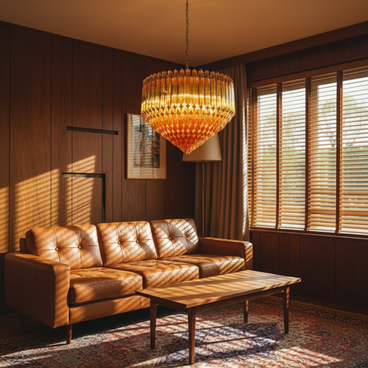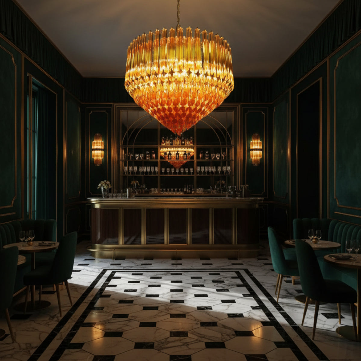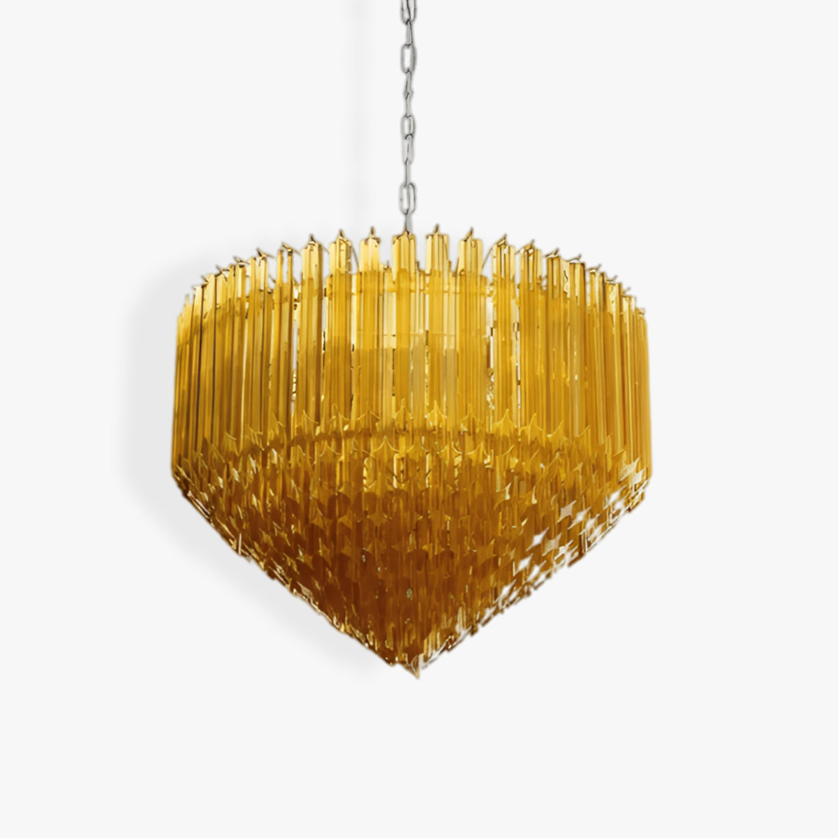 The Prism Amber Murano Glass Chandelier features layered amber glass prisms arranged in a structured geometric form, creating depth and visual rhythm. High-quality glass allows light to pass through with a soft, even glow, while subtle refraction adds texture without harsh glare. Supported by a durable metal frame, it offers both functional lighting and a refined decorative presence.