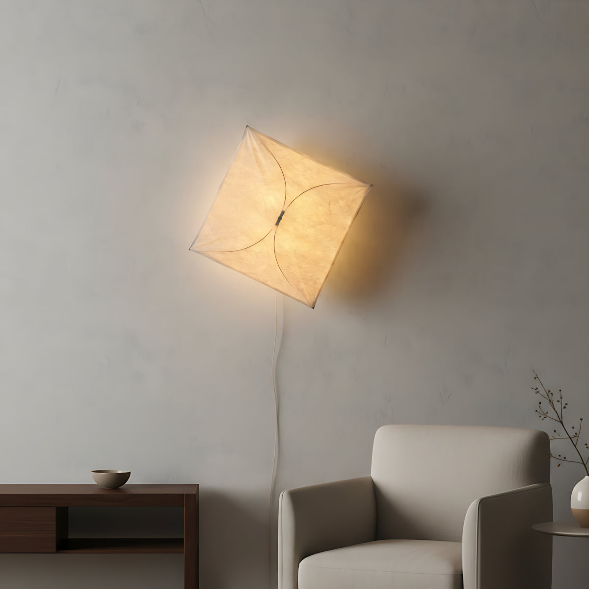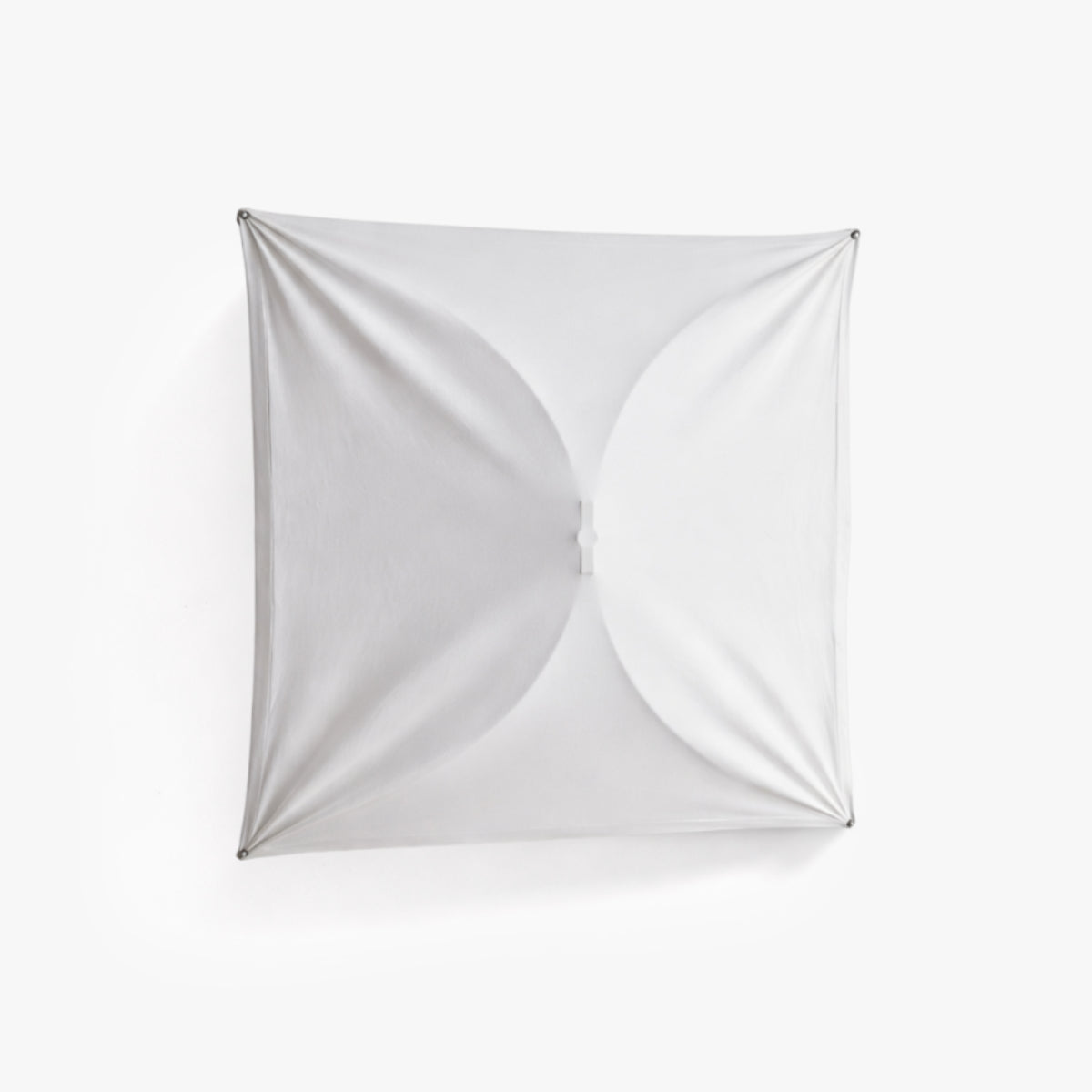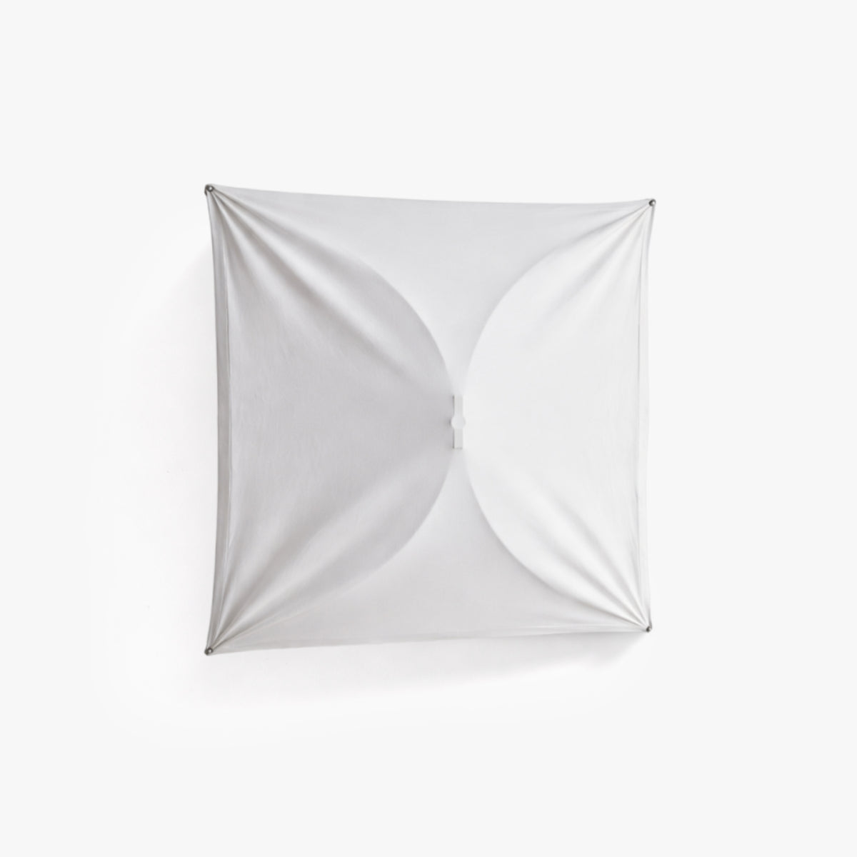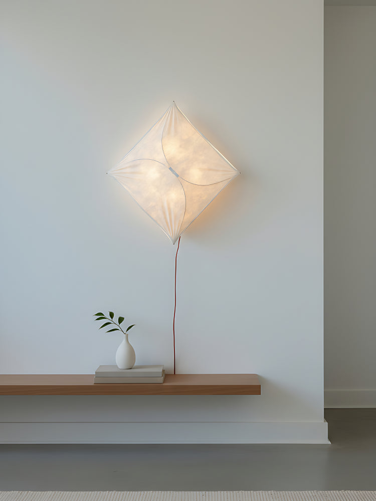 Die Wandleuchte Ariette Kite besticht durch ihre markante, quadratische Silhouette, die aus zwei weichen Stoffbahnen besteht, die von schlanken Fiberglasstäben getragen werden. Ihre minimalistische und zugleich ausdrucksstarke Form erinnert an die elegante Bewegung eines Drachens im Flug und vereint skulpturale Kunst mit funktionaler Beleuchtung.