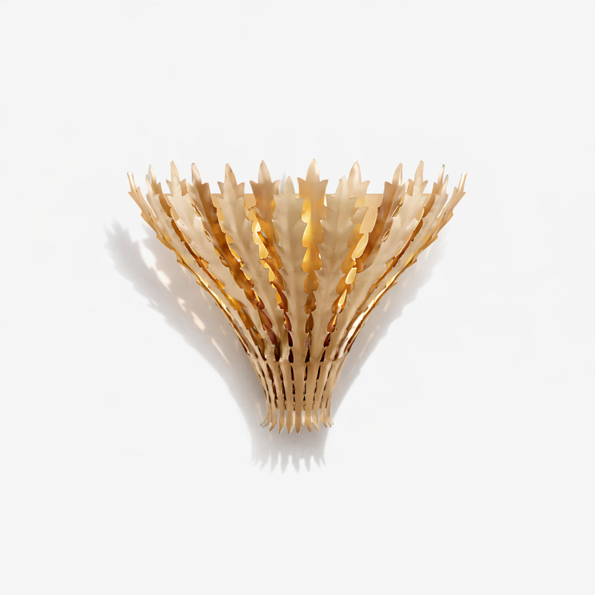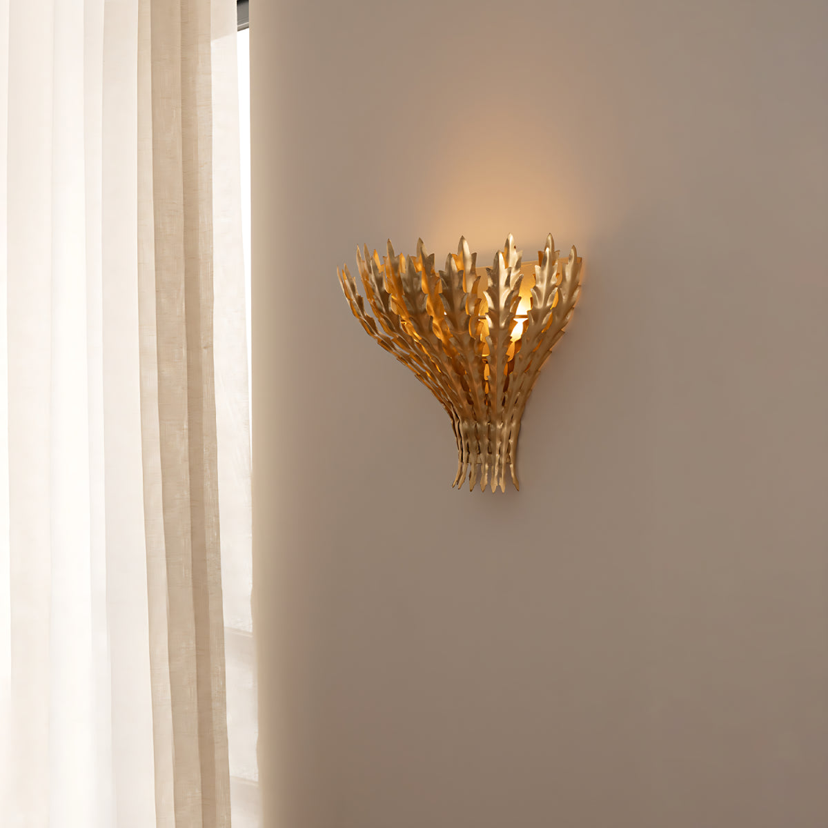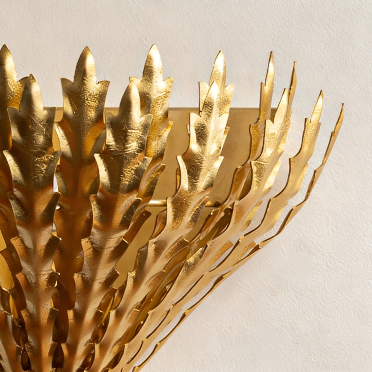 Die Wandleuchte Hampton besticht durch ihre mehrlagigen, mit Blattgold verzierten Metallelemente in Weizenform und verleiht jedem Raum eine warme, skulpturale Optik. Das nach oben gerichtete Licht sorgt für eine sanfte, stimmungsvolle Beleuchtung und dezente Schatten an der Wand. Durch die gelungene Kombination aus dekorativer Textur und funktionaler Beleuchtung setzt diese Leuchte einen raffinierten, von der Natur inspirierten Akzent und eignet sich ideal für Wohnzimmer, Flure oder Schlafzimmer.