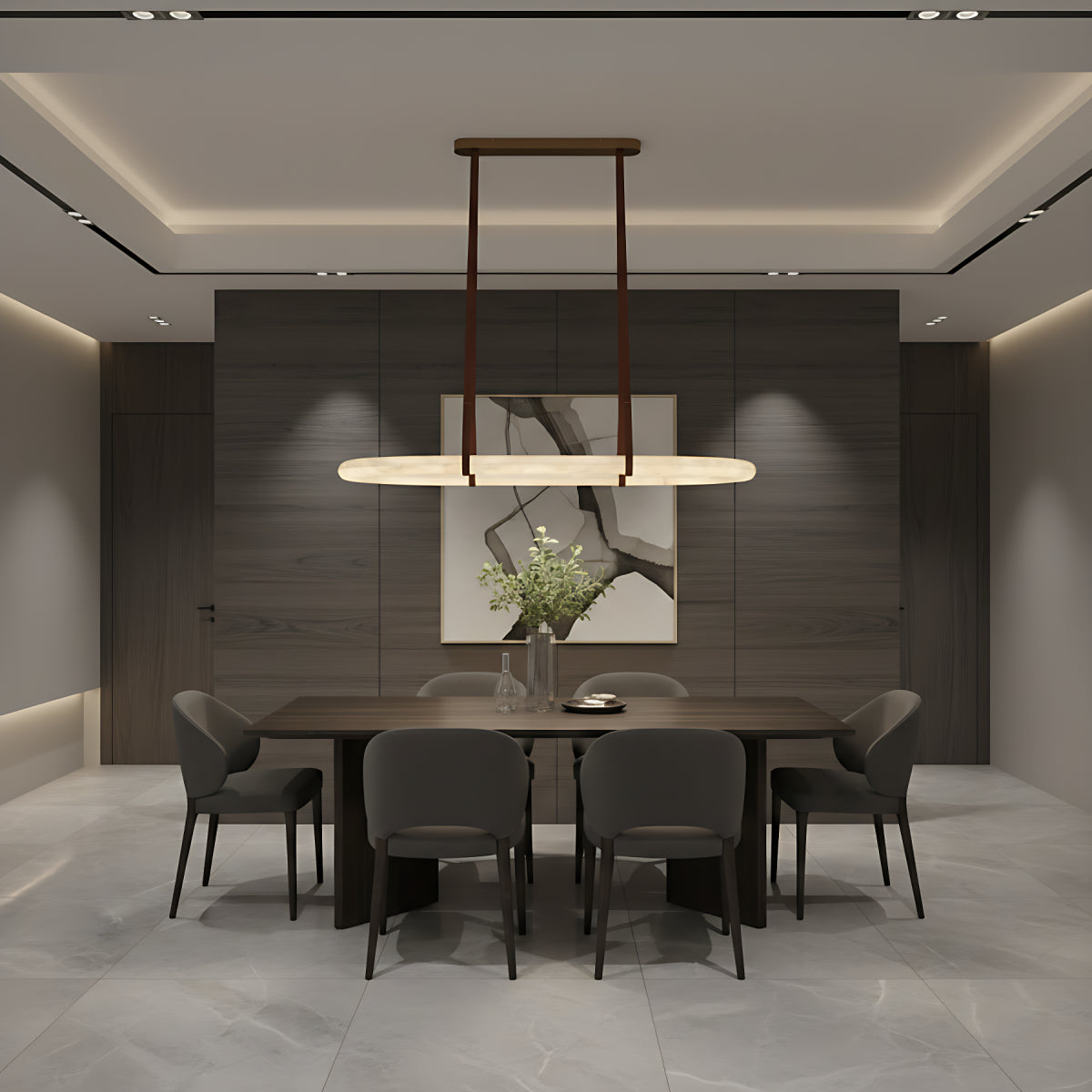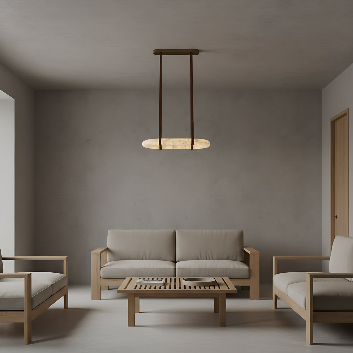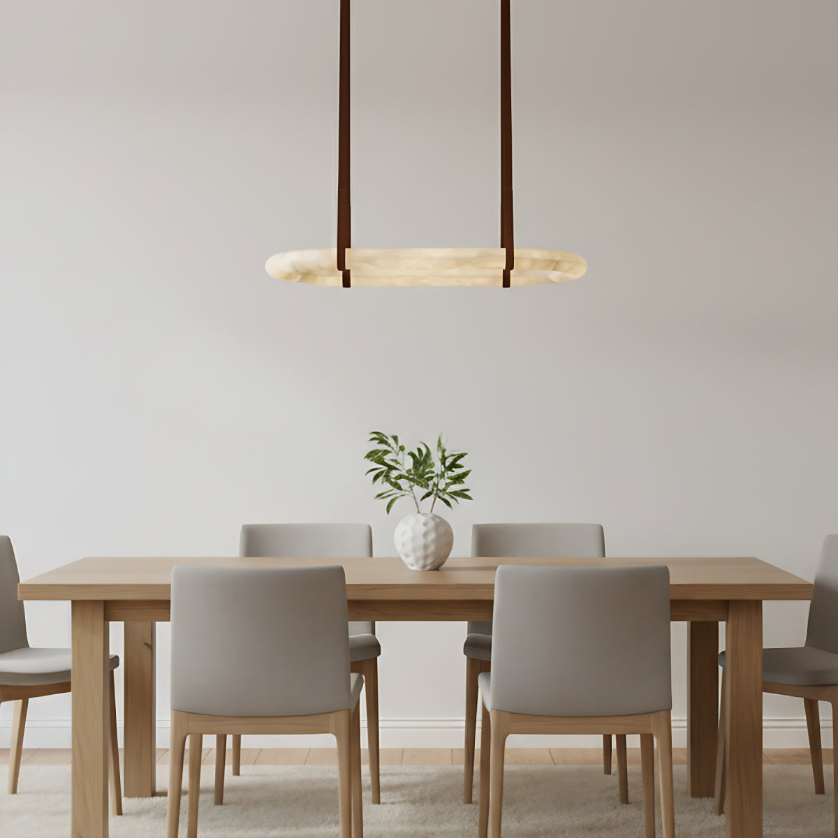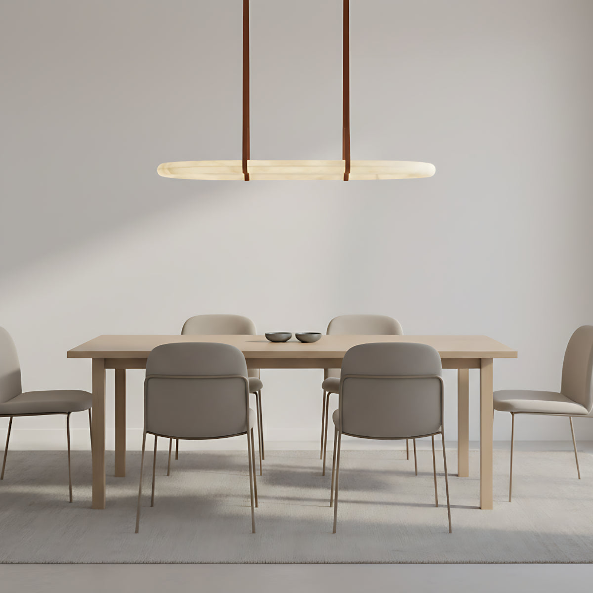 Le lustre Circle Alabaster, de forme ovale, est taillé dans de l'albâtre naturel et diffuse une lumière douce et chaleureuse. Ses sangles en cuir pleine fleur réglables permettent d'ajuster la hauteur de suspension, tandis que ses lignes épurées mettent en valeur la texture naturelle de la pierre. Conçu pour les intérieurs modernes, wabi-sabi ou minimalistes, il s'intègre parfaitement dans les salles à manger, les îlots de cuisine ou les espaces de vie.