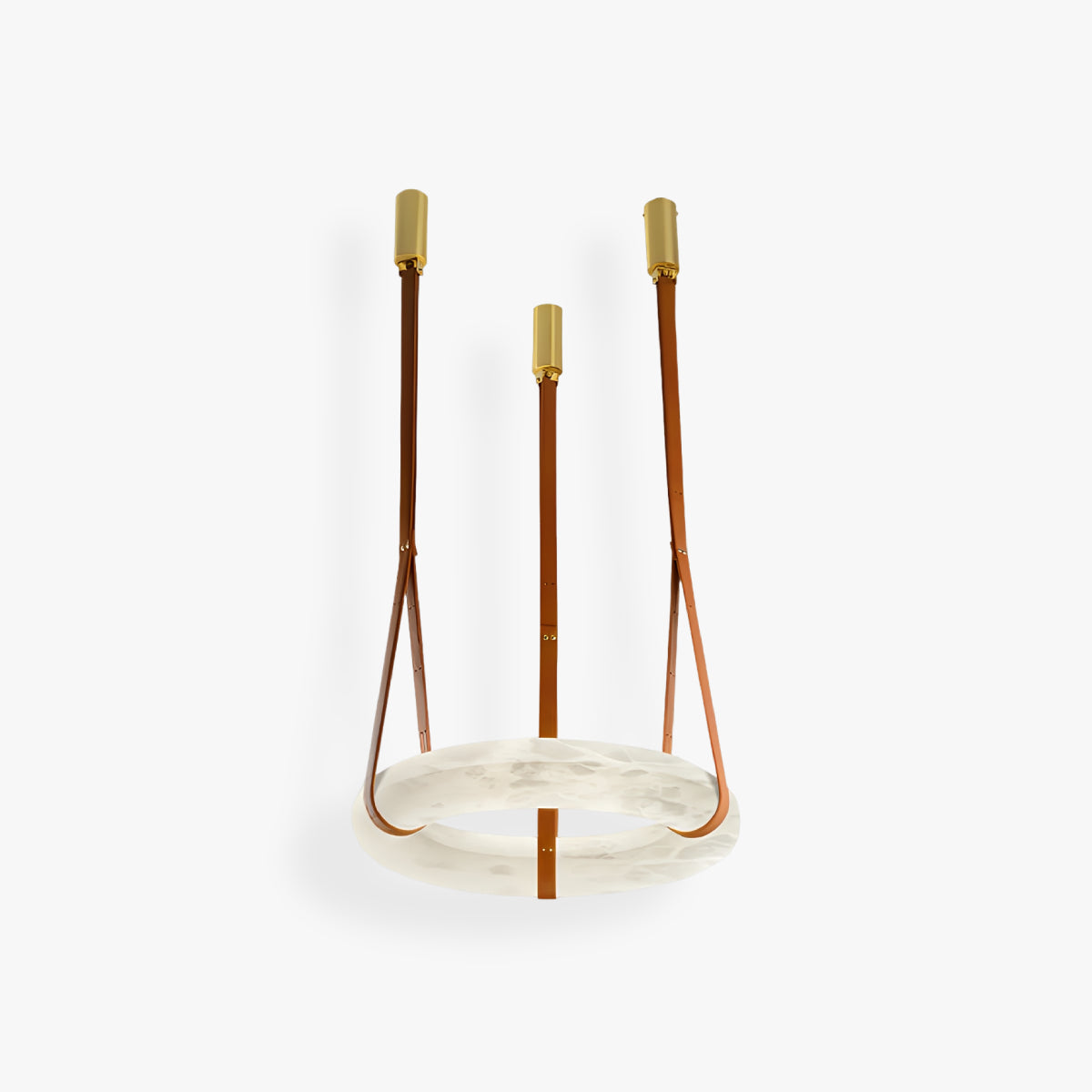 Le pendentif est suspendu par des lanières de cuir à trois couches spécialement conçues, offrant un maintien fiable et un détail visuel distinctif. Une structure en laiton massif complète le design, assurant durabilité et un contraste harmonieux entre la pierre, le cuir et le métal – idéal pour les espaces de vie ou de salle à manger modernes.