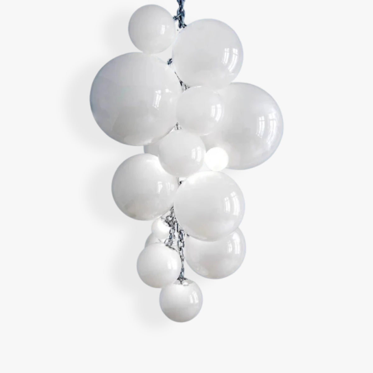 Elevate your interior with this Opaline Murano Glass Chandelier. Featuring an elegant cluster of opaque white glass spheres, it diffuses a gentle, uniform glow that warms any space. Suspended by a jewelry-inspired polished chain, this fixture blends artisanal quality with modern appeal. Its smooth finish ensures easy maintenance, making it a practical yet sophisticated focal point for your home.