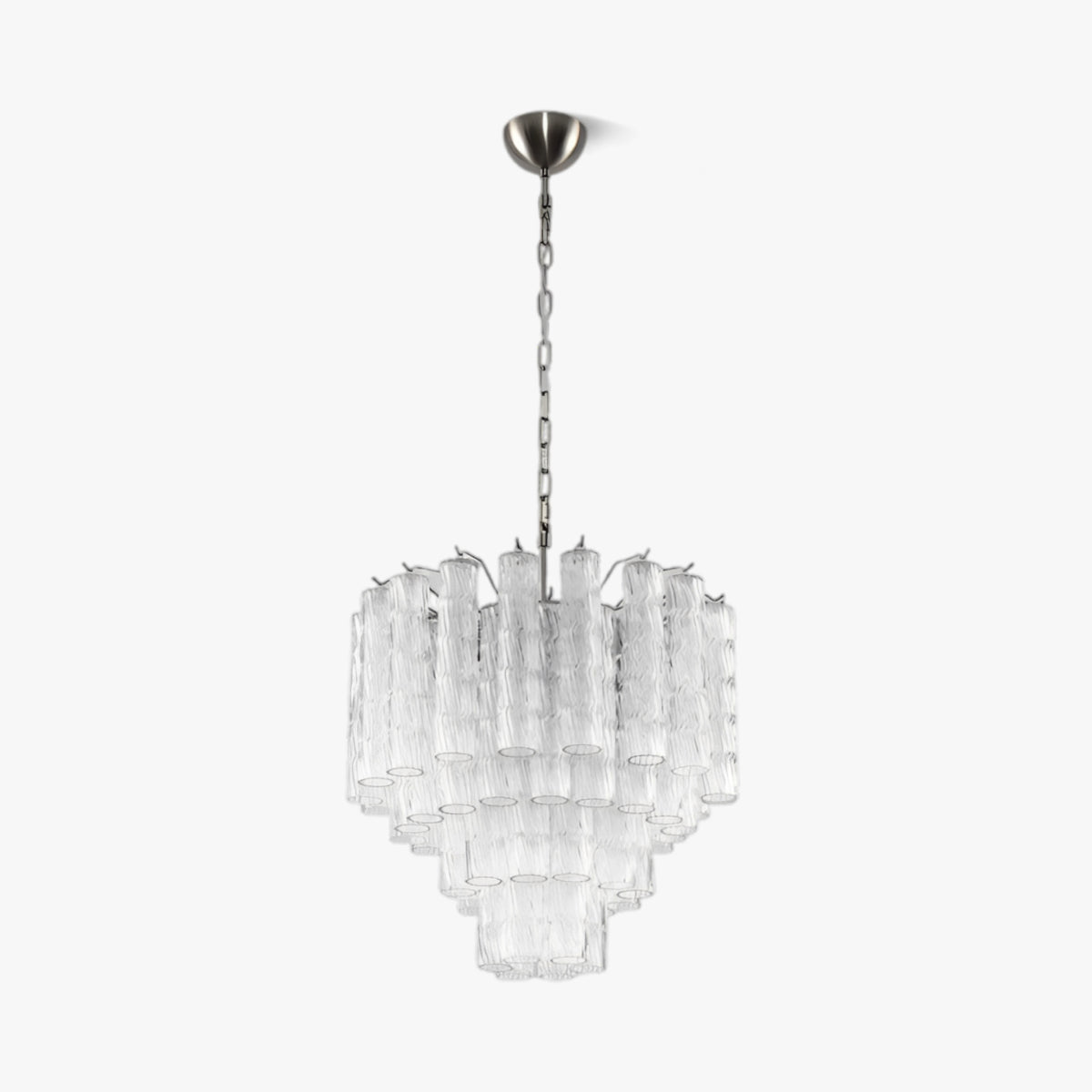 The Rialto Murano glass chandelier will add an elegant touch to your space. It subtly blends postmodern design with timeless elegance, composed of layered, high-transmittance ribbed glass cylinders outlined with simple metal fittings. This striking chandelier emits a warm, inviting, and glare-free soft light, adapting to various ceiling heights to create a sophisticated and inviting atmosphere in any room.