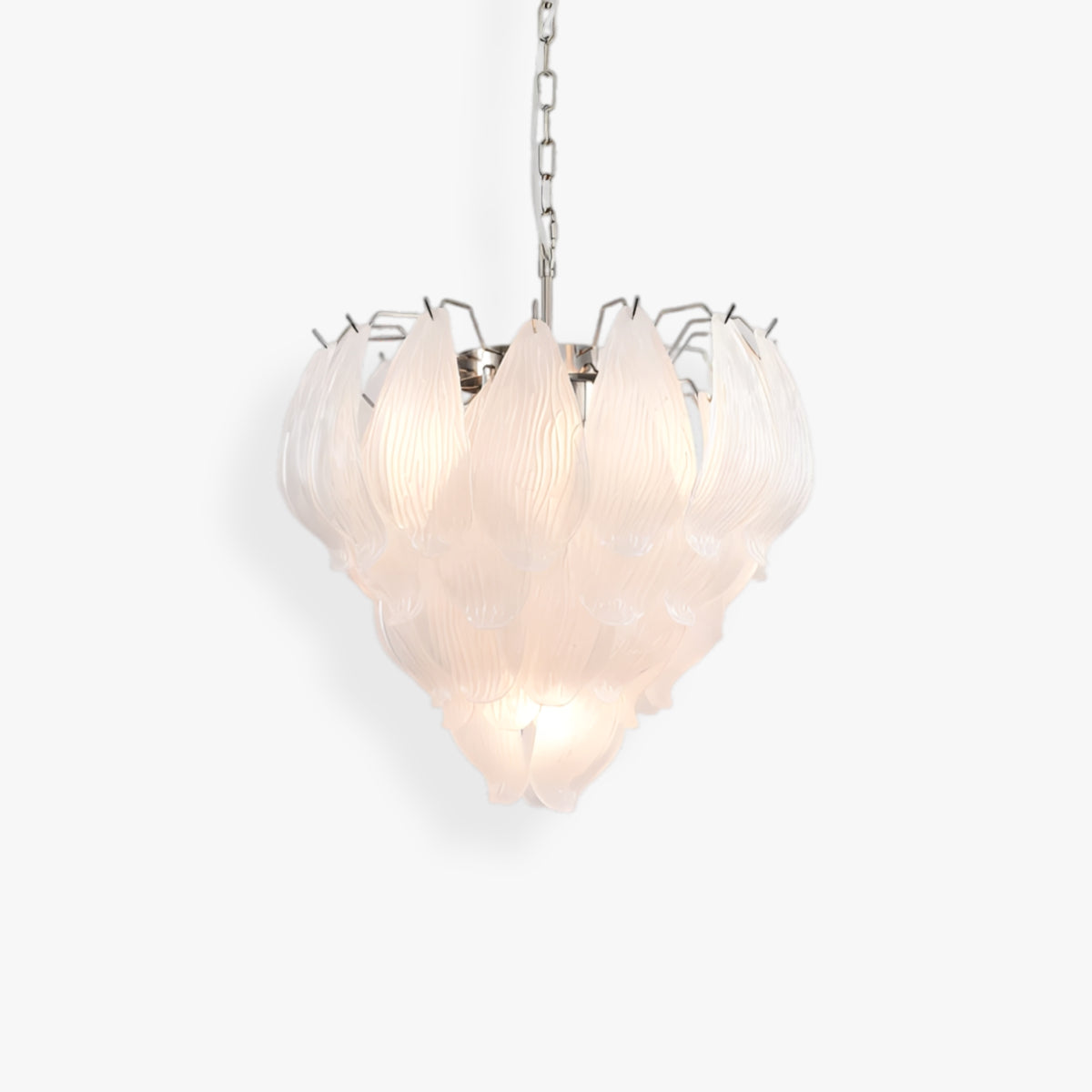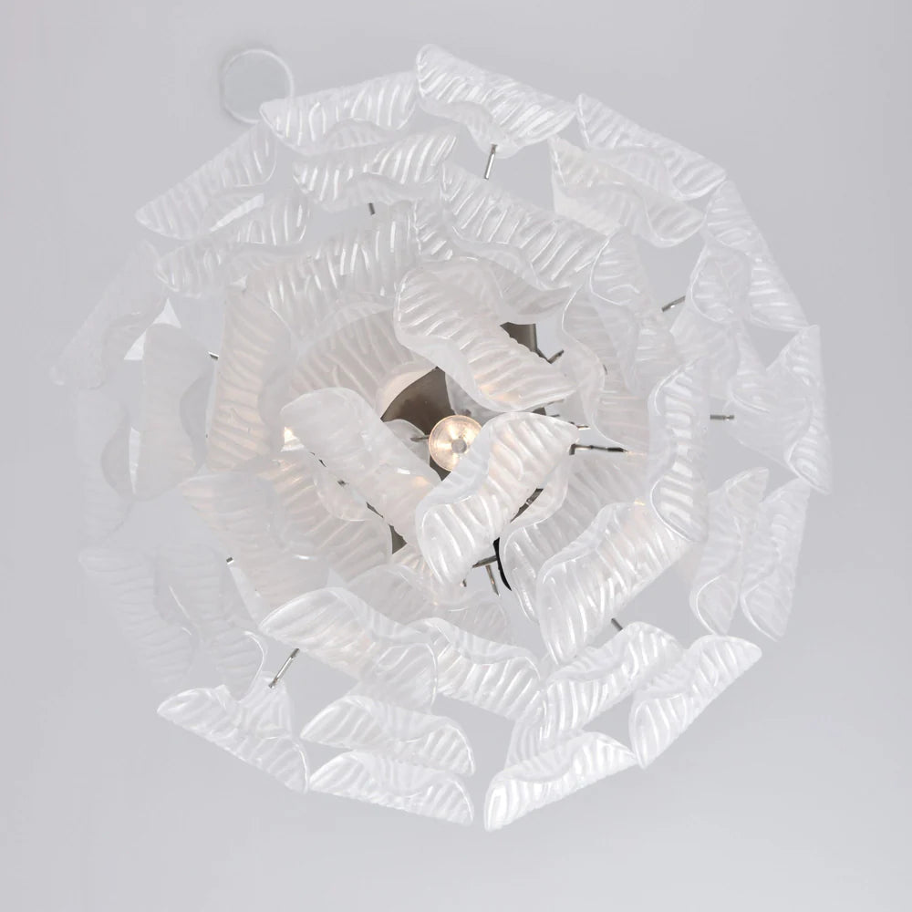 The Virel Murano Glass Chandelier features layered, feather-inspired glass panels that create a soft, flowing silhouette. The textured glass helps diffuse light evenly, producing a gentle and comfortable glow. Paired with a plated metal frame, the design balances decorative detail with practical structure, making it suitable for dining rooms, bedrooms, or entryways seeking a refined focal point.