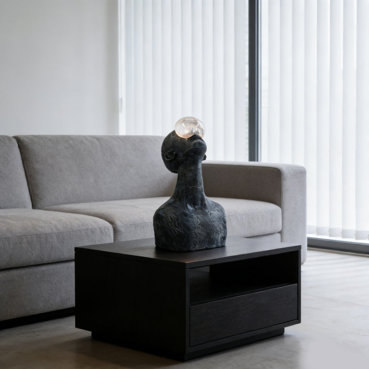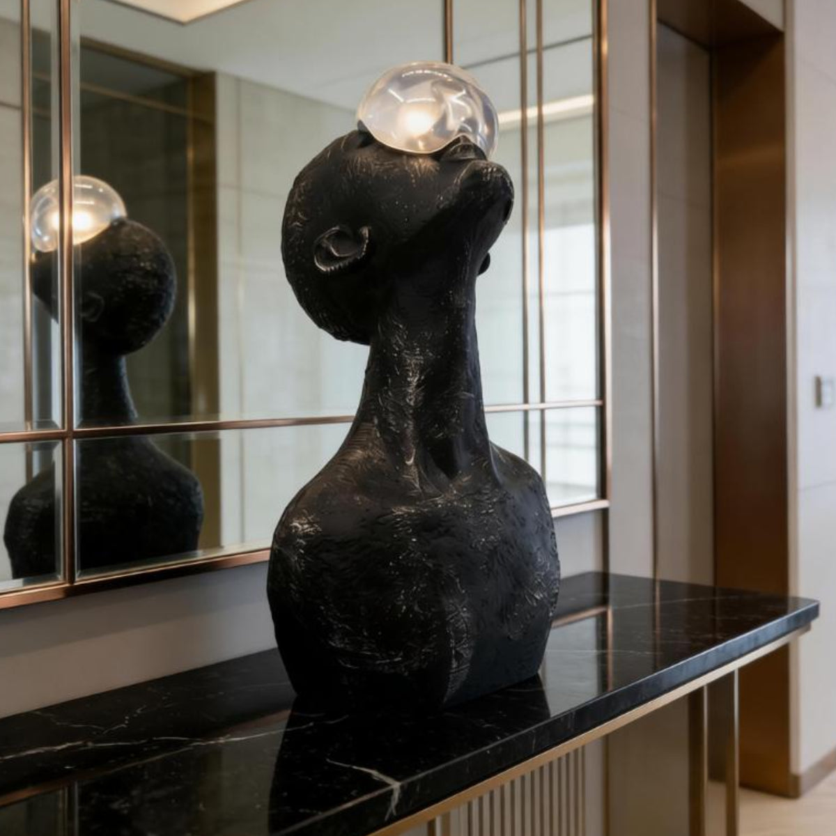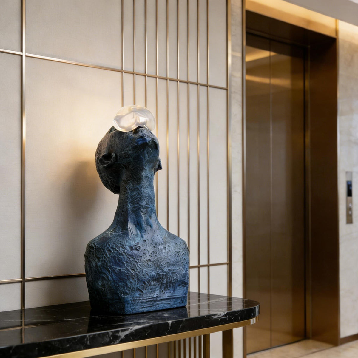 The Atlas Guardian Sculpture combines a half-body figure with elegant, outstretched posture, exuding a sense of serenity and strength. Crafted with handmade, textured surfaces resembling rock or clay, it offers a natural, rustic feel. A frosted glass lampshade crowns the sculpture, merging art and light seamlessly.