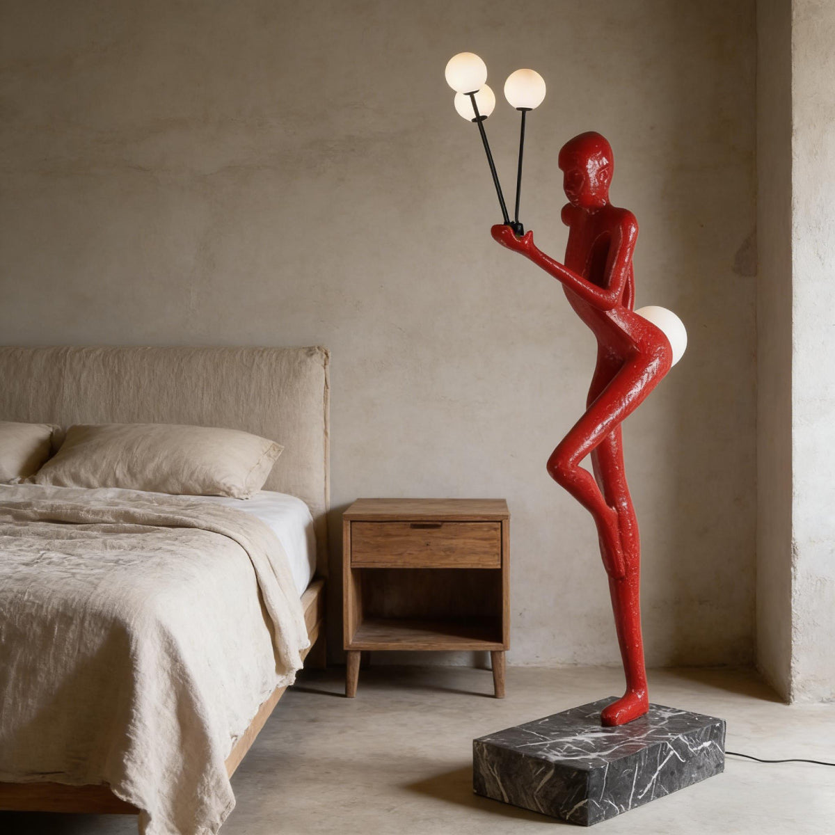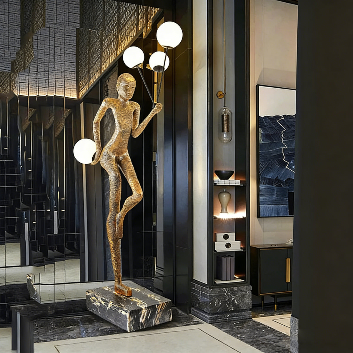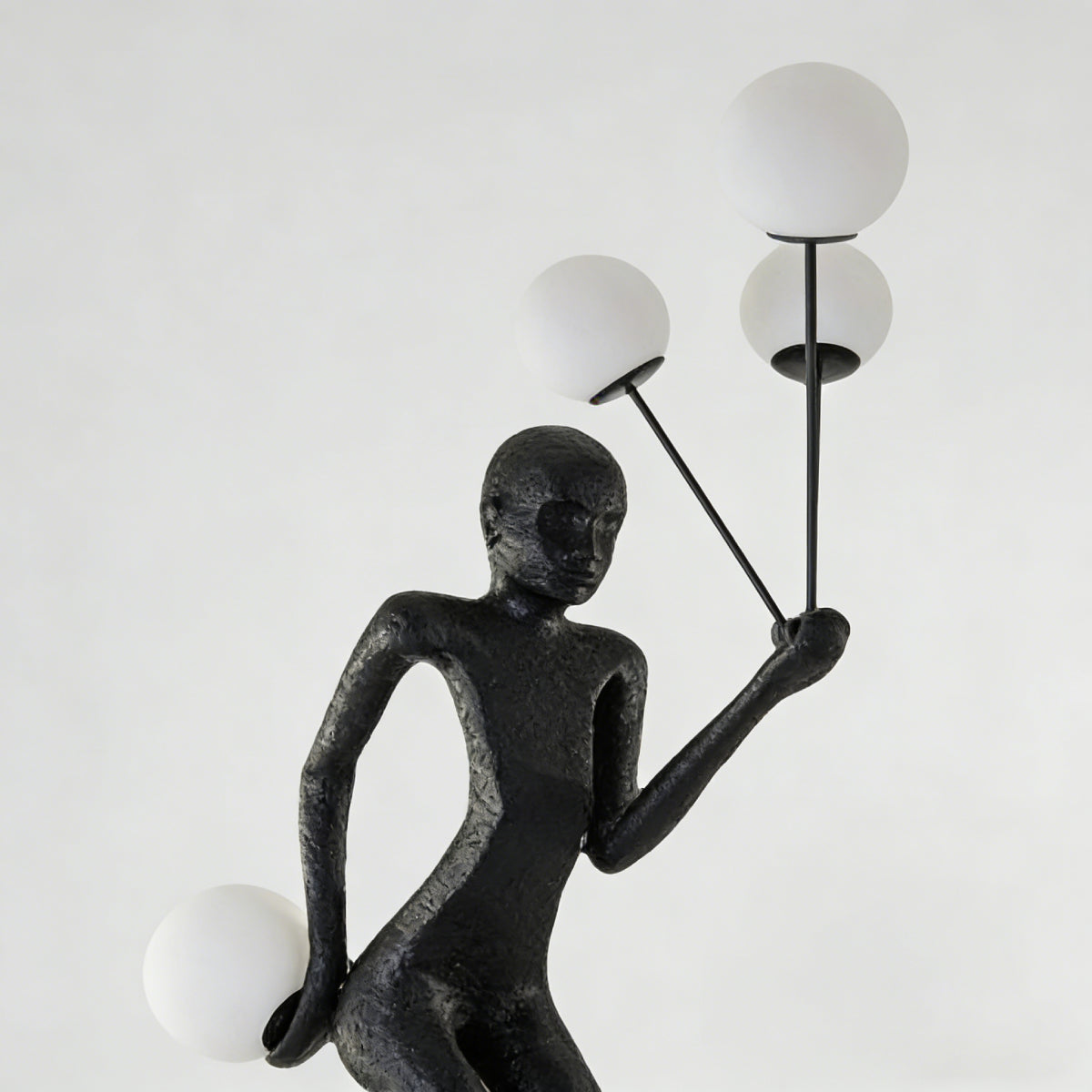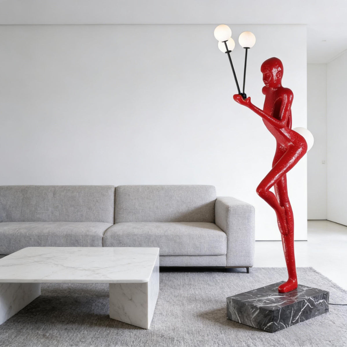 The Balloon Dancer Sculptural Floor Lamp features a dynamic, one-legged pose with a figure gracefully holding a balloon. Available in classic black, vintage gold, and vibrant red, this lamp uses four frosted glass globes for soft, diffused light. The natural marble base ensures stability and versatility across various settings.