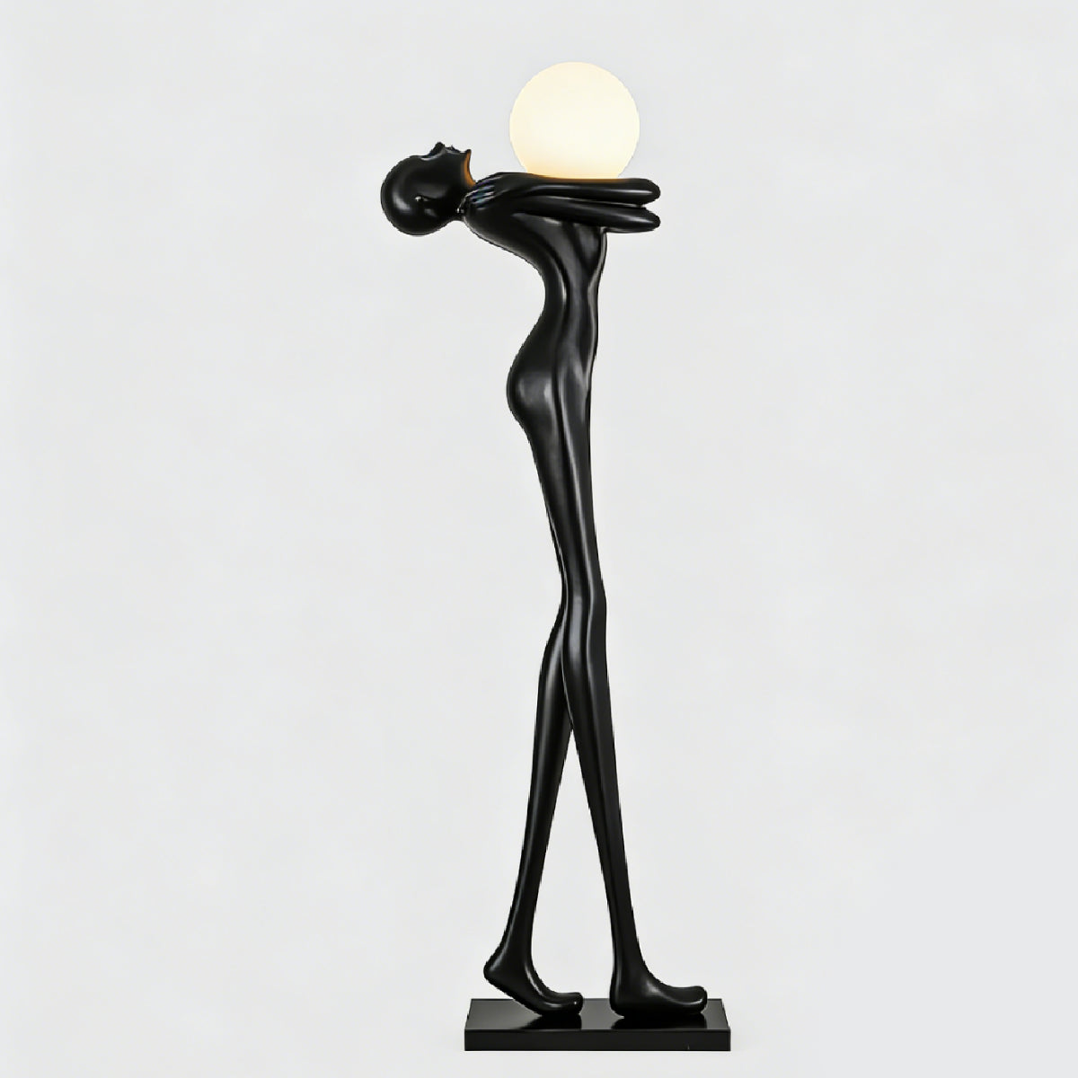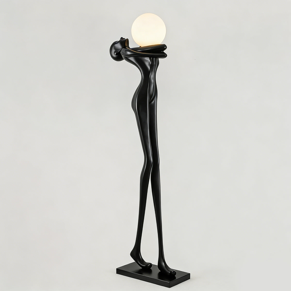 The Embrace Sphere Floor Lamp features a human-like figure embracing a glowing sphere, symbolizing warmth and strength. Crafted from matte black fiberglass, the smooth, delicate surface highlights the figure's graceful curves. The frosted globe lampshade diffuses a soft, warm light, while the tall frame and stable base ensure balance and elegance.