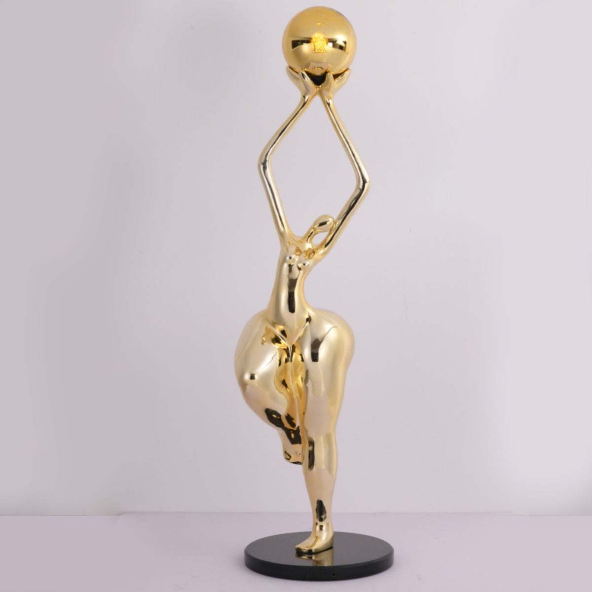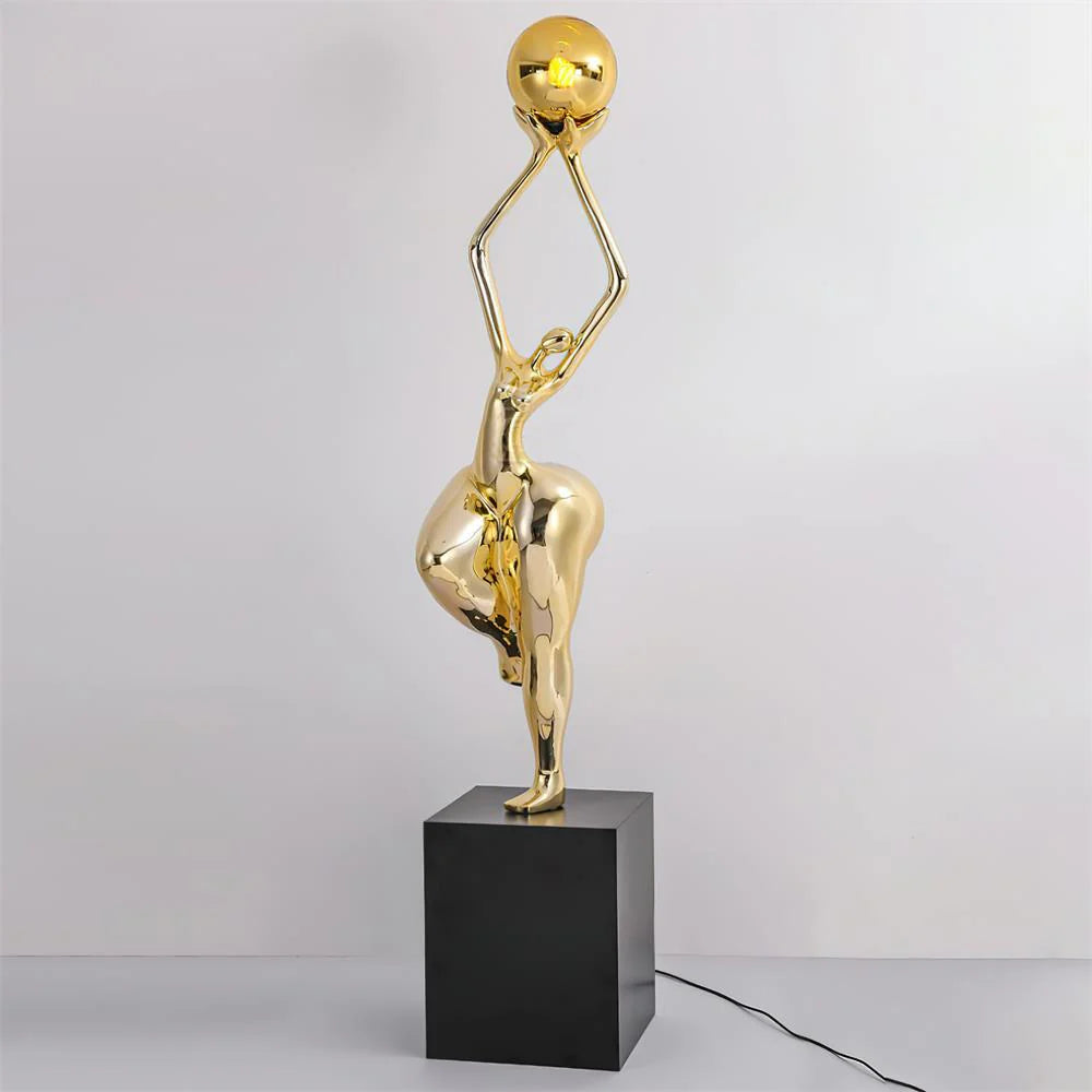 The figure lifts the glowing sphere with both hands, highlighting a balance of elegance and strength, creating a compelling visual focal point.