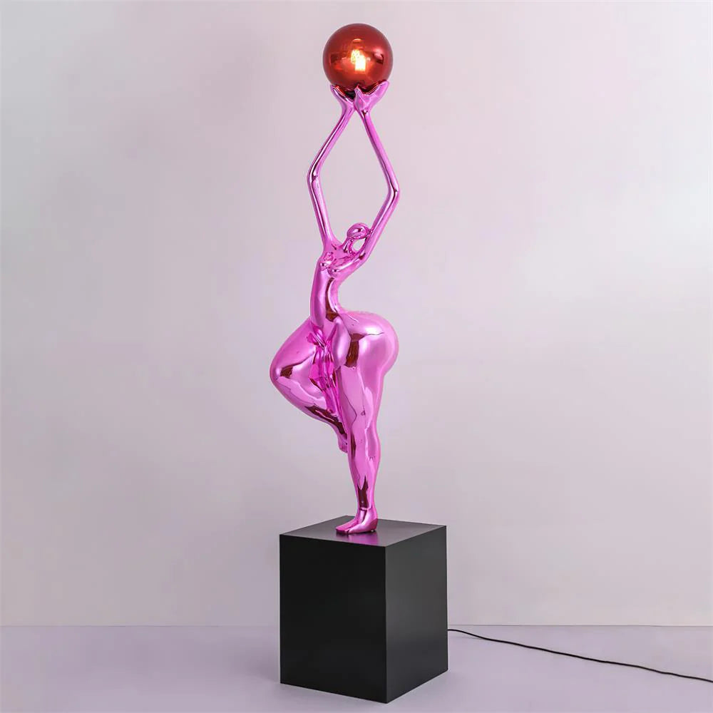 The Luna Sculpture Floor Lamp features bold, exaggerated curves with a matte black surface and electroplated pink and gold finishes. Its reflective surfaces enhance the sculptural design, and with two base options, it adapts seamlessly to different spaces, offering both beauty and function.