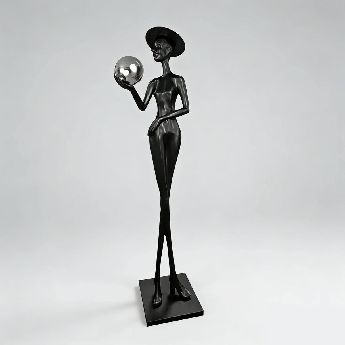 The Vivara Sculpture Floor Lamp features an elegant, hat-wearing female figure with a tall, slender form. Her crossed legs and graceful posture, gently holding the light, exude poise and refinement. Made from matte black resin, the lamp highlights the beauty of the human figure with minimalist lines, offering timeless elegance.